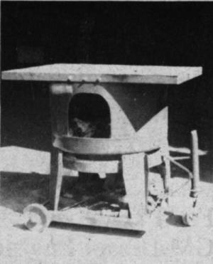 The metal bench top is bolted to the top of the old washer tub. Two wheels and a third dolly wheel transport it around the shop. Kraft cut holes in both sides of the washer tub to hold parts on tools when fixing a motor, or when making other repairs.