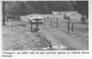 The gate opener uses two 6-in. high triggers installed in the drive path ahead of and behind the gate. Two aircraft cables run from each trigger to the gate post. When a tire pushes the trigger bar down one way, the cable activates compression springs that open the gate. When the vehicle runs over the trigger on the opposite side, the springs close the gate. When the vehicle comes through the gate from the other direction the triggers simply work in reverse.