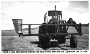 Kragel first took a look at mounting a seeder on the side of a pickup box, but didn't like the results. His offset seeder reaches out to the side of the tractor to get right over the terrace.
