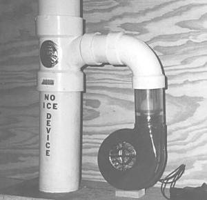 The "No Ice-Device" from Behrens Construction, Minot, N. Dak., prevents ice build-up in outlet stacks by blowing room-temperature air up into them. It's powered by a small electric fan that forces room temperature air into the stack. The unit can be wired into a thermostat so it automatically turns the fan on when the furnace starts and off when it stops, or into a timer or switch.