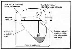 When filling the hopper, the float is held up out of the way by a hook at top of hopper so it doesn't get buried by seed.