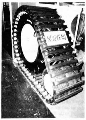 The Dario tracks have a double bogie wheel that's mounted on a tightener arm that bolts to the axle of the wheel they're mounted on. With the rear end of the tractor jacked up, the tracks slip on over the wheels and then the arm is tightened to hold the tracks securely in place. Unlike steel cleats, the rubber-coated cleats can be driven over the road. And because of the easy-mount design, they can be mounted or dismounted with ease, unlike other add-on tracks which are often left in place when not needed because they're so difficult to install, ac-cording to company representative Pierre-Jean Cosmao.
