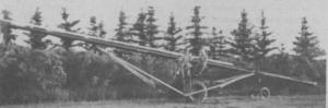 Starting with a 61 ft. long, 8-in. dia. auger, Bang added a power unit which is the tractor portion of a Super 27 Massey Ferguson combine. He extended the combine's rear axle 5¢ ft. to give the auger more stability.