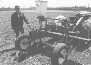 To build the test unit, Litchfield used the support wheels and æV' closing wheels off an old Deere corn planter, the seed box off an Allis-Chalmers planter, and the gauge wheels off an International planter.