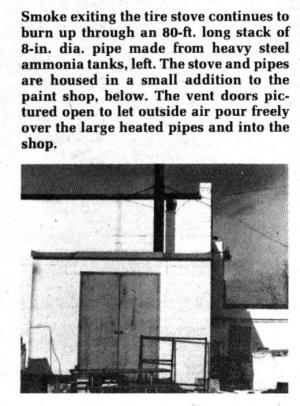 He and his father installed their tire stove in a small brick addition to the paint shop in such a way that it can be stoked from the outside. One tire heats their shop for about an hour so they stoke the stove morning and night with a full load of 10 to 12 tires. Jim notes that what little smoke comes out of the stack is as clear as that given off by a highly efficient wood burner.