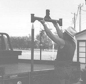 Lifting Attachment For Dual Bale Spikes On Pickup Flatbed BALE HANDLING Bale Handling (31B) 21-5-37 We made a lifting attachment for the dual bale spikes on our pickup flatbed. I built it be-cause I know of someone who twisted the bed of their truck by pulling with one spike. We made this device to fit over both spears to pull fence posts, lift down cows, carry equipment, and even pull small trees and shrubs out of the ground. We even use it to pick up our lawnmower to change blades.