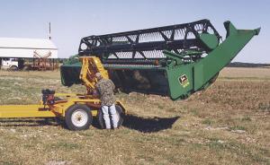 The "Transporter" is a tandem axle trailer equipped with a 5 hp Briggs & Stratton gas engine. The engine powers a hydraulic pump that's used to raise and lower a specially de-signed 3-pt. hitch mounted above the tandem axles. (A specially designed attachment re-places the 3-pt. for hauling grain headers).