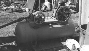 He Built His Own Pto-Driven Air Compressor FARM SHOP Tools 22-3-30 Jack Dyck, Richmond, B.C.: "I built my own pto-driven air compressor by mounting a right angle gearbox and pulley unit - salvaged from an old tractor- on a steel bracket that I bolted onto a 200-gal. air tank. I also mounted a used compressor equipped with its own pulley on the bracket. I use a tractor to pto-drive the gearbox which belt-drives the compressor. The compressor blows air through a copper tube that goes through the bracket and into the tank. The original pulley on the gearbox was designed for a flat belt. I replaced it with a bigger 2-groove pulley, using an adapter to install it.