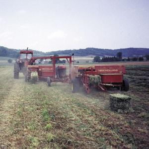 "The distance between the front of the tractor and the bale chute on the rear baler is 60 ft. We find that it does require some skill to operate two balers at once. Fortunately we have nice level fields and plenty of room to turn. We drop the bales on the ground and pick them up later with a self-propelled automatic bale wagon."