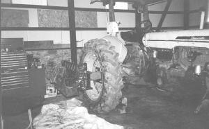 The engine stand consists of a short piece of I-beam and steel plate that runs parallel to the tractor wheel. It welds to a length of sq. steel tubing that bolts to the tractor wheel in four existing wheel weight bolt holes.