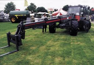 His "Teletrak" is equipped with a 3-pt. hitch and drawbar on back and a 3-section, center-mounted boom on front. The boom has a maximum lift capacity of 3 tons, a lift height of 22 ft., and the ability to lift 1 ton at a maxi-mum forward reach of 14 ft. Power is provided by a 106 hp turbocharged 4-cyl. Perkins 1004 engine mounted under the cab. The tractor is equipped with a mechanical transmission instead of the conventional torque converter transmission. Electronically engaged four and crab-wheel steer modes make the machine very maneuverable.