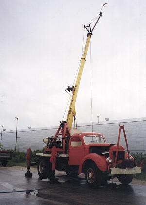 The truck is fitted with a standard 26 ft. boom with 16 ft. jib extension I fabricated from stock pipe and metal. A large boom cylinder was fabricated for me in Winnipeg. All other hydraulic components - hoses, fittings, cylinders, pumps and valves - were purchased from Princess Auto in Winnipeg.