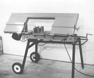 The commercial high-speed Matrix blade is 3/4 in. high by 0.035 in. wide by 106 in. long. It's driven by two pulleys and a gearbox from a 3/4 hp electric motor mounted on one side of the table.