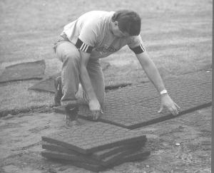 Interlocking rubber bricks are about 8 by 6 1/2-in. and 7/8-in. thick; rubber tiles are about 19 in. sq. and 1 3/4-in. thick; "Z" bricks are about 8 1/2 by 4 1/2 in. and 1 1/2 in. thick.