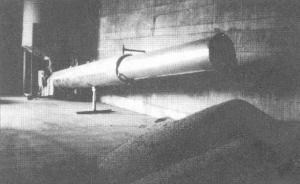 The 32-ft. long, stainless steel machine consists of a Teflon-coated auger inside a 14-in. dia. tube. The first 20 ft. of the tube is surrounded by a 20-in. dia. "heating chamber" that holds 165 gal. of oil, heated by four electric heating elements. A 4-in. thick layer of fiberglass around the heating chamber keeps heat in as beans are augered through.