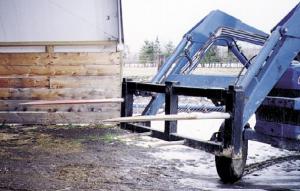 i've always had a problem getting hay to my bison. After I take the first bale in, the younger animals wait at the gate for me to come in with a second bale, making it much harder to re-open the gate to get in. I solved the problem by converting my bale spear to take two bales at a time instead of one. I moved the existing center spear over to the side and bought a second spear and bushings to mount on the other side. The two small spears at center still provide extra support. I bought the bushings and second spear from ATI Corp., 325 West Amin St., New Holland, Penn. 17557. (Stephen Fitzpatrick, 1435 Pontiac Rd., Angola, N.Y. 14006)