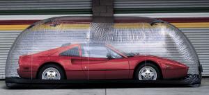 The standard 6 ft. wide, 24-ft. long enclosure has a base made from PVC fabric. You "peel" the cover open by unzipping it around the entire base and drive the vehicle to be stored onto the base. Then pull the cover back over, zip it up, and plug in the fan to inflate the unit. The entire process takes only about 3 minutes.