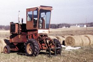 My brother John and I recently finished converting an International 303 self-propelled combine into a round bale hauler. We bought the combine from Jim Streeter of Shell Lake, Wis., who had already started work on the project. We call it the Streeter 303 special.