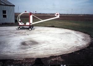 Helicopter: The helicopter is 6 ft. high, 14 ft. long, and has a 10-ft. long main blade and 20-in. rear fan blade. The wind actually turns both blades. Of course, the helicopter doesn't fly but I do pull it in parades. It looks real. I got the idea to build it after I sold a 36-ft. dia. grain bin which left a large round cement pad. It looked like a helicopter pad to me.
