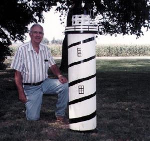 Lighthouse: It's made from a 5-ft. long piece of 13-in. dia. PVC pipe. I cut holes in the pipe for windows and put a light inside. A plastic pail sits on top, with holes cut out of it to provide the effect of a blinking warning light (a timer is connected to the light). The lighthouse sits in our front yard and really looks great. We haven't had a single boat run into our trees ever since I put it up. (Vince Kramper, 498 190th St., Dakota City, Neb. 68731 ph 402 987-3560).
