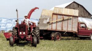 He mounted a dumping forage box on back of a 1-ton pickup and rigged up a tailgate that opens automatically when the box is dumped. Then he set out to find a way to tow the truck behind his forage chopper.