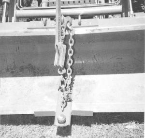 "I also made a temporary ball hitch attachment that fits over the lower lip of the loader, held in place by a chain that fits over one of my loader grab hooks. I use the hitch to move an 18-ft. flatbed trailer. It eliminates the need to look back when backing up. Real handy and goes on and off in seconds with a load binder."