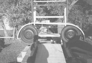 "I built it at a friend's junk yard and used a few parts from his ĉinventory'. I used the frame of a hydraulic press and 20-ft. lengths of angle iron. I had to go through a half dozen tires to find one that was straight enough to run true. I ended up using 14-in. Mazda car tires.
