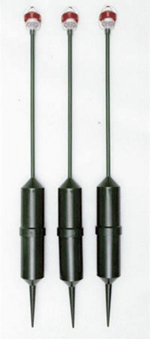 At the top of each post is a scent dispenser that contains a sweet-scented oil that acts as an attractant. Around the dispenser are two circular electrodes made of stainless steel wire. Electricity runs across them from a miniaturized charging circuit that's powered by two AA batteries. When deer, attracted by the scent, touch the device, they receive an uncomfortable but harmless shock that frightens them from the area and makes them afraid to return. The top cap on each post is red, making it easy for people to see and avoid getting shocked themselves.