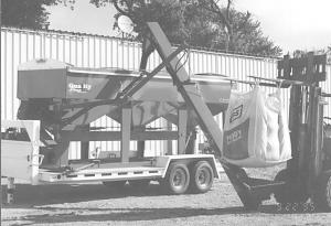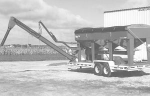The three trailer-mounted hoppers empty onto a 10-in. wide belt conveyor that delivers seed up to a chute on front of the trailer. The chute drops seed into an 8-in. wide "swingaway" belt conveyor that's used to fill any planter or drill and is also used to load the hoppers. The conveyor can be automatically raised or lowered by a hydraulic cylinder mounted on a steel arm that attaches to the conveyor.