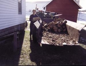 "This system eliminates a lot of work," says Kling. "Our house has a wood furnace in the basement, with a chute going up through a window. We simply back the spreader up to the chute. Spreaders are ideal for this use because they have big tires that can handle a big load. Each spreader holds about three face cords of wood.