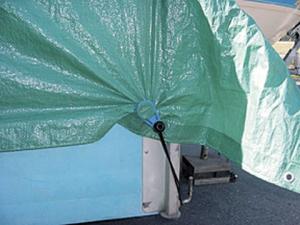 The plastic clamp consists of two pieces - a 3 1/2-in. long oblong piece and a 1 5/8-in. dia. circular one. You put the circular piece on the back side of the tarp and then push the oblong piece against the tarp and down onto the circular piece to lock the two pieces together. Works great for covering hay bales, wood piles, boats, RV's, swimming pools, etc. They sell for $2 each with a minimum order of five clamps; 12 clamps sell for $20 and 25 for $30. Add $5 for S&H. (GadgetBrothers, 141-6200 McKay Ave., Suite 731, Burnaby, B.C.,