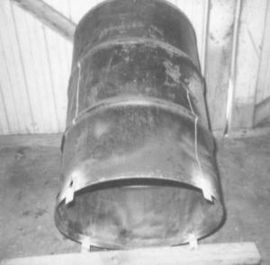 Prebble removed both ends of a 55-gal. drum. Then, he fastened four legs of welded 1/8-in. thick steel to the bottom rim with 1/4-in. bolts. The legs are 1 1/2 in. wide by 3 in. long which elevates the barrel about 2 in. off the ground, creating a chimney effect.