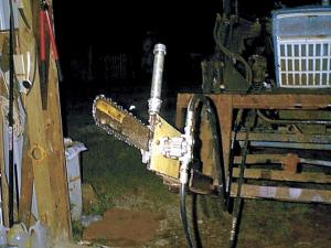 The Mount Juliet, Tennessee man salvaged the bar, chain, sprocket and one side cover from an old chain saw and mounted them on one side of a steel plate. He mounted a .45 cubic inch hydraulic motor onto the steel plate.