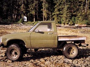 I noticed that a lot of Toyota 4-WD pickups get driven to the dump because the frames rust out behind the cab. However, Toyota engines seem to run forever so I bought a Toyota 4-WD pickup and chopped the frame off behind the cab. Then I used lengths of square tubing and 2 by 4's to build a flatbed over the pickup's frame. I also shortened the driveshaft and rotated it up by placing shims between the axle and springs. With the shortened wheelbase it really turns sharp.