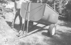Prom laid the tank sideways and cut out one side, installing a lift-off tailgate on back. He used rectangular tubing to make an axle that's equipped with car spindles attached to a pair of 13-in. wheels. The tank pivots about two thirds of the way back on a steel frame. The frame narrows up toward the front to form a tongue that's equipped with a ball coupler. A boat winch mounts on the tongue, with cable from the winch riding up and over a pair of pulleys. The cable connects to the front end of the tank. To dump the load, he simply cranks the winch.
