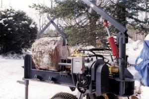 The boom can be used on either side of the splitter. Tongs grab the chunks of wood.