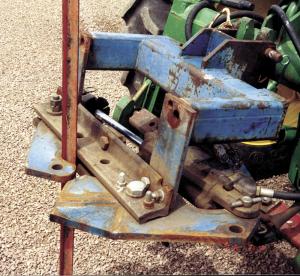 The post puller was built from a hitch off an old anhydrous ammonia applicator, and some heavy railroad track angle iron. It consists of a steel jaw that's hinged in the middle and is attached to a hydraulic cylinder. Extending the cylinder closes the jaw around a post. The 3-pt. is then raised to lift the post out of the ground.