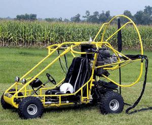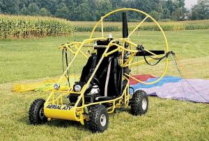 To fly, a 3-cylinder 100 hp engine-driven prop puts it in the air and keeps it there at 40 mph. Like other Buckeye powered parachutes, the Aerial ATV enjoys the safety factor of floating to the ground should the engine quit. Also like the company's conventional powered chutes, the unit can fly at 10 ft. or 10,000 ft.