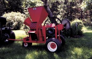 The 3-wheeled rig mounts on a frame made from 2-in. channel iron and has two chutes - one on top for leaves and brush and another on front that handles branches up to 3 in. in diameter. Power is provided by an 8 hp Kohler gas engine which belt-drives a home-built chipping hammer.