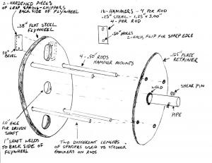 He started with a heavy duty squirrel cage fan housing. He built a steel cylinder fitted with four steel rods. Sixteen hammers that measure 1 1/4 by 3 in. bolt to the rods. The hammers are staggered to provide chopping action across the entire width of the cylinder. The hammer rods mount between two discs made from 1/4-in. thick steel plate. He cut two slots on one of the discs 180 degrees apart, then inserted 2 by 3-in. chunks cut out of an old car leaf spring and put a 30 degree bevel on them.