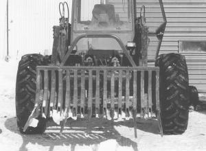 The bigger fork is 9 ft. wide by 5 ft. deep, and has 18, 5-ft. long, sharp teeth that are tapered and spaced about 6 in. apart. These teeth are 1 in. wide and 5 in. deep at the base. They're made for spearing bales but also work beautifully to pick up rock. The fork cost Findlay $5,200 (Can.) to build.