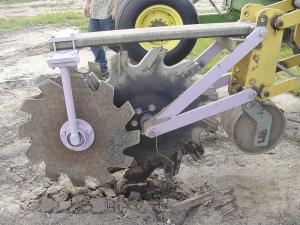 It tills zones that are 6 to 9 in. deep in any type of soil, without creating smooth sidewalls and pulling up huge clumps of soil. Tilling is accomplished by a massive 34-in. coulter on each row unit. The case hardened 3/8-in. thick coulter has 10 integral ductile iron cutting bits that are 1 1/4 in. thick and 5 in. long. The bits create a spoon-like cutting action that slices through residue and digs deep into any type soil, creating a U-shaped zone of aerated soil. Two 26-in. coulters with a unique "saw blade design" are mounted behind the primary coulter. They float free without down pressure to gather soil and form it into a neat berm. This row unit is so unique that Bauer has applied for a patent on the design.