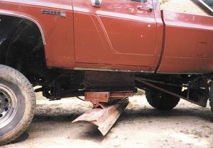 The blade is secured to the plate it's mounted on at five different places to provide maximum support. "If I hit a solid object such as a tree stump, I'll know right away - it gives me quite a jolt," says Manszewski. "I bent the pickup frame twice when I accidentally hit stuff that I couldn't see. Finally, I installed shear pins on the cylinders that raise and lower the blade."