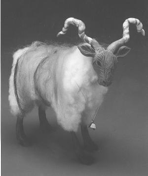For the sculptures, she uses smooth fence wire to form the animal's frame and then inserts fiberfill stuffing. For most sculptures, she then molds their faces and legs from clay. The animal's own fiber is used to "clothe" it, retaining the same texture and color as the animal it represents. Nowicki sews all the pieces together, but says the stitches disappear within the fiber.