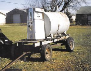 He mounted a 500-gal. tank on a 4-wheel cart along with an older-style gas station pump. "Most people don't have pumps to move their oil so I just stick my hose in their tank and use the gas station pump to move it to my tank. Works great."