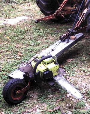 "It works great on trees that are a maximum of 8 to 10 ft. tall," he says. "A chain saw mounts on a steel plate at the rear of the tractor. He didn't modify the chain saw at all. Once the chain saw is running, he uses a cable to control the throttle from the tractor seat. He fashioned a hand-operated lever to swivel the chainsaw and the plate against tree trunks.