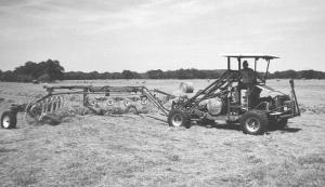 "Even though the seat mounts crosswise it's easy to drive. The steering wheel, brake pedal, gas pedal and gearshift are all located as natural as driving a car. I use a joystick control to operate the loader. For both loader and rake-pulling work, most of the time I run the transmission in 4-wheel-drive low gear, which has a top speed of 35 to 40 mph. I had to relocate the master brake cylinder because there's no firewall or cab to mount it on."
