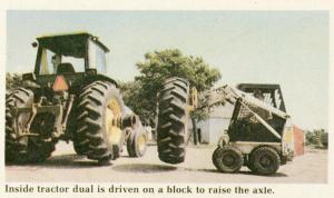 When the Jensens want to turn, remove or install rear outside duals on a tractor, they simply slip the home-made attachment onto the end of their Bobcat 310 skid-steer loader. "If you don't own a skid-steer, the attachment can be just as easily designed to slip onto the bucket end of a conventional tractor-mounted loader," explains Ervin.