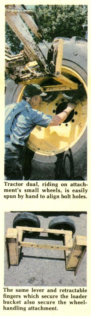 Two 11 in. dia. gauge wheels equipped with solid rubber tires were salvaged from an old cultivator and mounted about 15 in. apart on the wheel-handling attachment. To install on an outer dual, for example, you simply drive the existing "inside" rear tractor wheel onto a block of wood. Then, with the attachment in place on the loader, you pick up the outside dual and carry it to the tractor (see photo). The small gauge wheels not only carry the heavy dual but allow it to be easily turned clockwise or counter-clockwise, making it simple and safe for one person working alone to align the holes and insert the lug bolts.