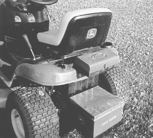 The Osler, Sask., man built a simple 12 by 12 by 10-in. box out of tin and slipped it into an angle iron frame welded to two flat iron arms that fit holes on the tractor's frame next to the hitch.